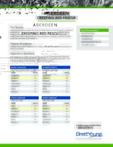 Aberdeen is a strong creeper that represents a significant advancement in overall turf quality for creeping red fescue. It has very good spring green up, drought tolerance, genetic color and is consistently ranked in the top of turf quality trials, even when compared to many chewing fescues. Aberdeen exhibits excellent red thread and dollar spot resistance.
